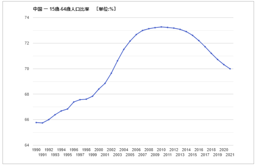 中国の生産年齢人口(15~64歳の人口)の比率は「2010年」がピークでその後は低下。