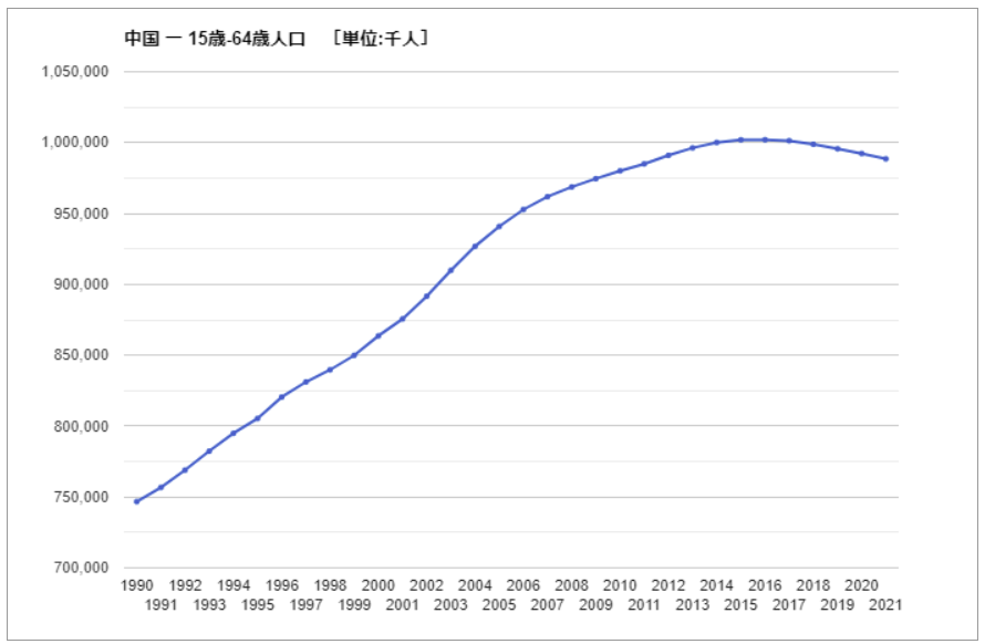 中国の生産年齢人口は「2016年」がピークでその後減少。