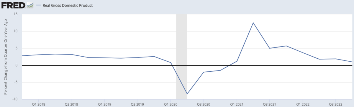 2022年第4四半期の米国GDP速報値は前期比年率でみると実質で「+2.9%」となり、なにも衝撃的なことはないのですが、前年同期比でみると実質で「+1.0%」でした。