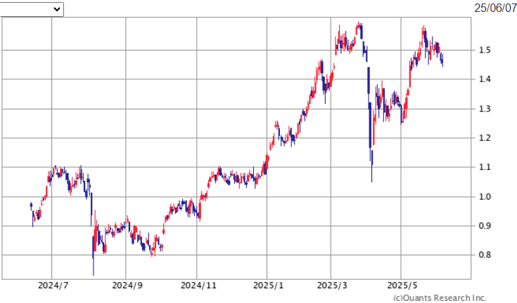 2025年5月の日本株のPBRは「1.2」倍(前月比±0.0)。