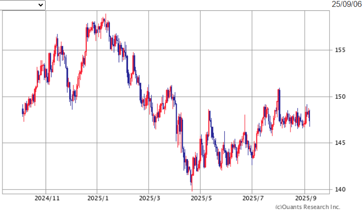 直近値は1ドル「147.4」円。前週は「147.0」円で円安。