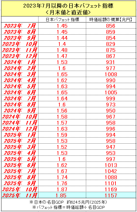 直近の日本バフェット指標は「1.88」(前週は1.85)。